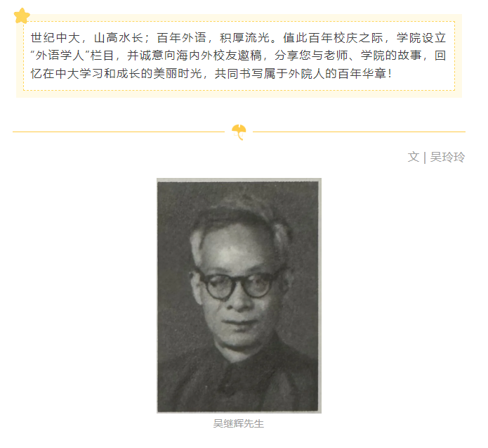 20世纪50年代初到60年代末,在中山大学康乐园内,经常有一个年纪不太大却是满头白发的中年教师,提着一个装着书的橘黄色皮包,大步流星地往返于东北区的居住地与西南区的外语系,那就是我亲爱的父亲吴继辉。