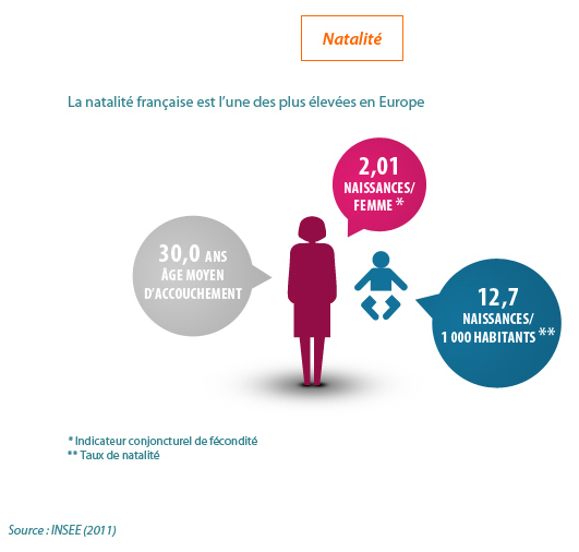 Il y a eu 828 000 naissances sur l'année 2010 au niveau des années record de 2006 et 2008. La fécondité augmente, essentiellement grâce aux femmes de plus de 30 ans ; les femmes ont en moyenne 2,01 enfants en France, niveau le plus élevé depuis la fin du baby-boom. L'âge moyen à l'accouchement augmente et a atteint 30 ans en 2010.