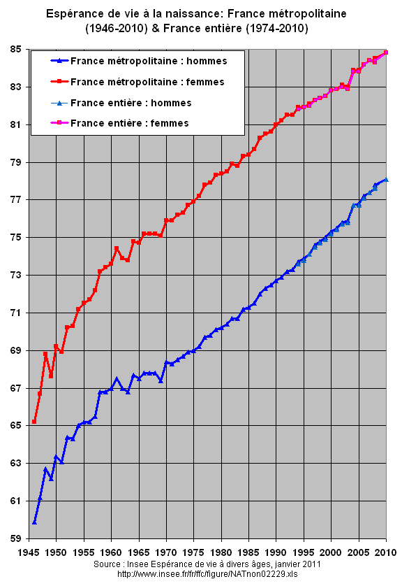 Entre 1994 et 2010, l'espérance de vie à la naissance d'une personne de sexe masculin née et vivant en France a gagné près de quatre ans et quatre mois, tandis que celle d'une personne de sexe féminin née et vivant en France a gagné trois ans.