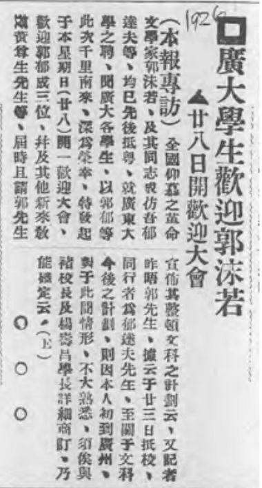 《广大学生欢迎郭沫若》,广州民国日报,1926年3月26日