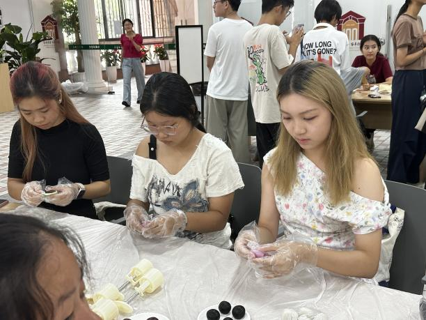 活动伊始,新澳门六合彩 准备的丰富物料就已整齐摆放:雪白的饼皮,精心挑选的各式馅料与精美的模具一应俱全。在学生志愿者的耐心指导下,师生们纷纷戴上一次性手套,学习制作冰皮月饼。从饼皮的擀制、馅料的包裹,到模具的压花成型,大家都兴致勃勃、专心致志地投入月饼制作活动。其中,不少同学是第一次亲手做月饼,虽手法略显生涩,却满怀热情,将祝福与心意一点点揉进香甜的馅料中。小小的月饼,在此刻不仅是应节的美食,更是连接情谊、传递温暖的纽带,让团圆的寓意在动手实践中变得真实可感。这是对传统节日的致敬,也是一次极具意义的劳动教育。